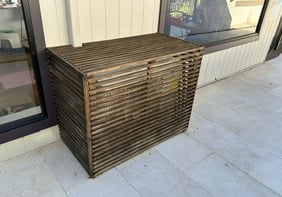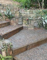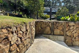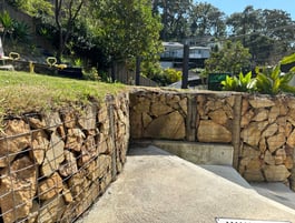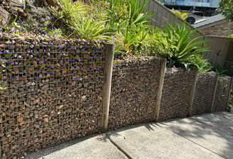 Hide old-fashioned copper-log retaining walls behind a contemporary gabion basket facing.